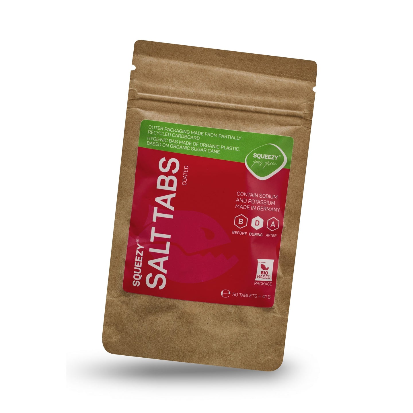 Squeezy SALT TABS mit den Mineralien Natrium und Kalium zur Einnahme während starker körperlicher Anstrengung mit hohem Schweißverlust. Mit 500 mg Kochsalz je Dragee.