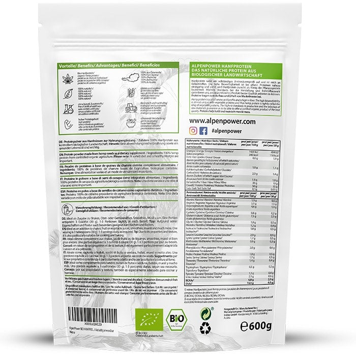 Das Bio-Hanfprotein von AlpenPower ist ein rein natürliches, pflanzliches Eiweißpulver mit hoher Bioverfügbarkeit – gewonnen aus schonend entölten Hanfsamen aus kontrolliert biologischem Anbau in Österreich. Frei von jeglichen Zusatzstoffen, Zucker oder Aromen liefert es eine wertvolle Portion Protein, ideal für alle, die sich vegan, gesund und nachhaltig ernähren möchten.