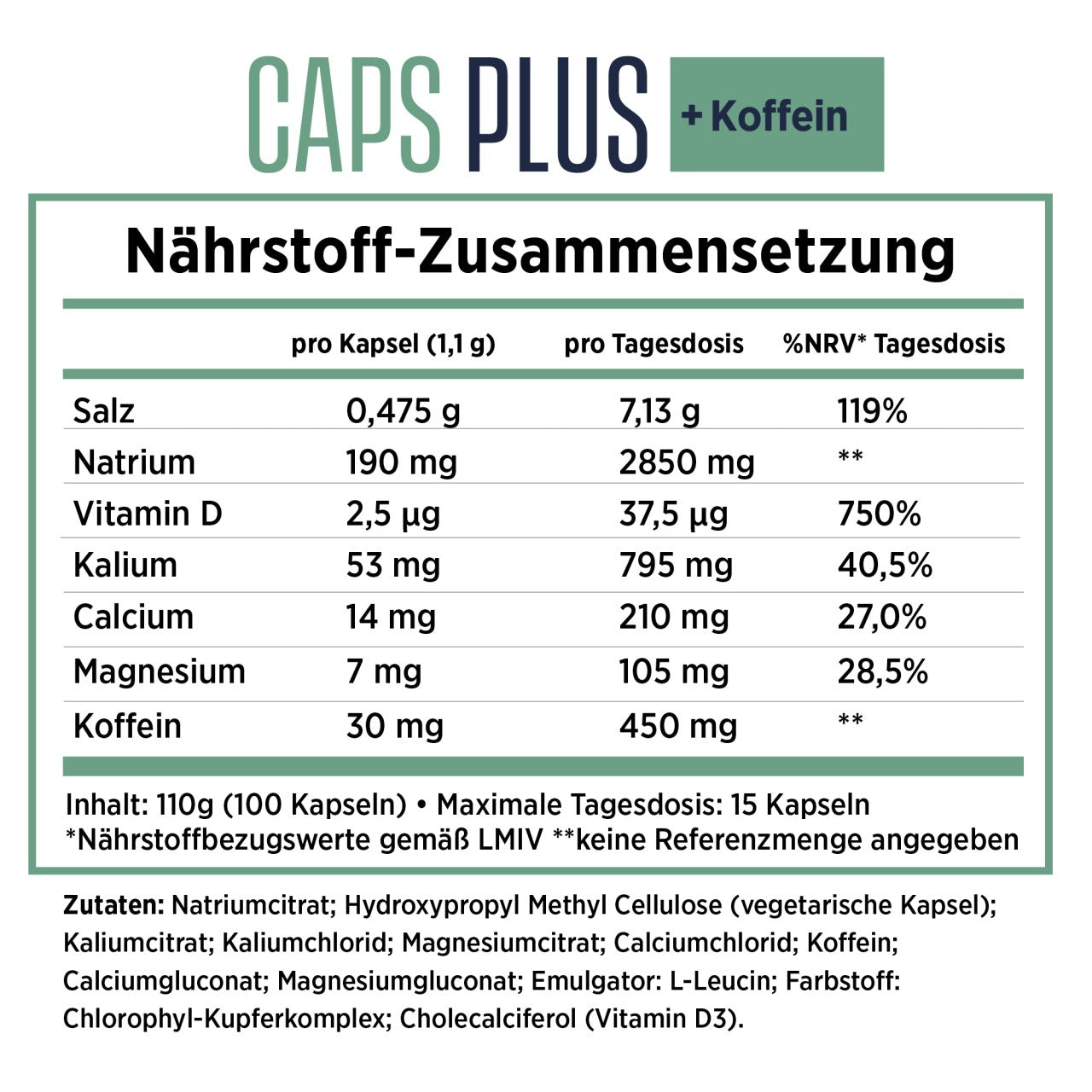 Koffeinhaltige Salztabletten mit Premium Wettkampf-Formel zur Elektrolytversorgung des Körpers. Mit Koffein und Natriumcitrat-Salz. Die SaltStick Race Ready Plus Kapseln unterstützen mit Salz (Natriumchlorid), essentiellen Mineralstoffen (Kalium, Calcium, Magnesium) und Vitamin D3 deine Leistungsfähigkeit während starken körperlichen Anstrengungen mit hohem Schweißverlust.