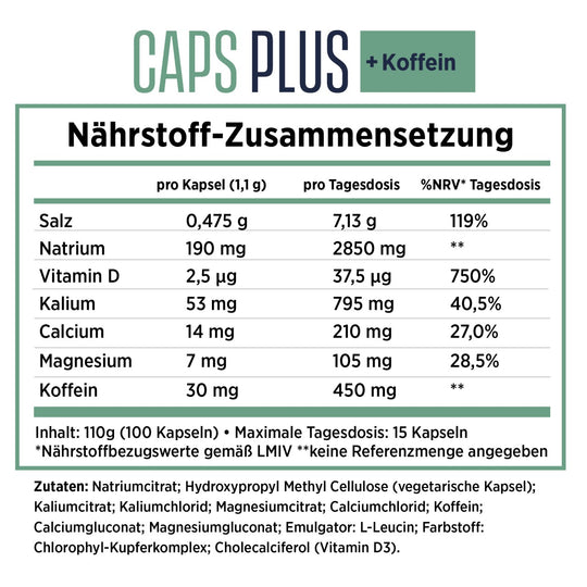 Koffeinhaltige Salztabletten mit Premium Wettkampf-Formel zur Elektrolytversorgung des Körpers. Mit Koffein und Natriumcitrat-Salz. Die SaltStick Race Ready Plus Kapseln unterstützen mit Salz (Natriumchlorid), essentiellen Mineralstoffen (Kalium, Calcium, Magnesium) und Vitamin D3 deine Leistungsfähigkeit während starken körperlichen...Aktueller Preis € 35,99Regulärer Preis € 39,99Aktueller Preis € 35,99Regulärer Preis € 39,99