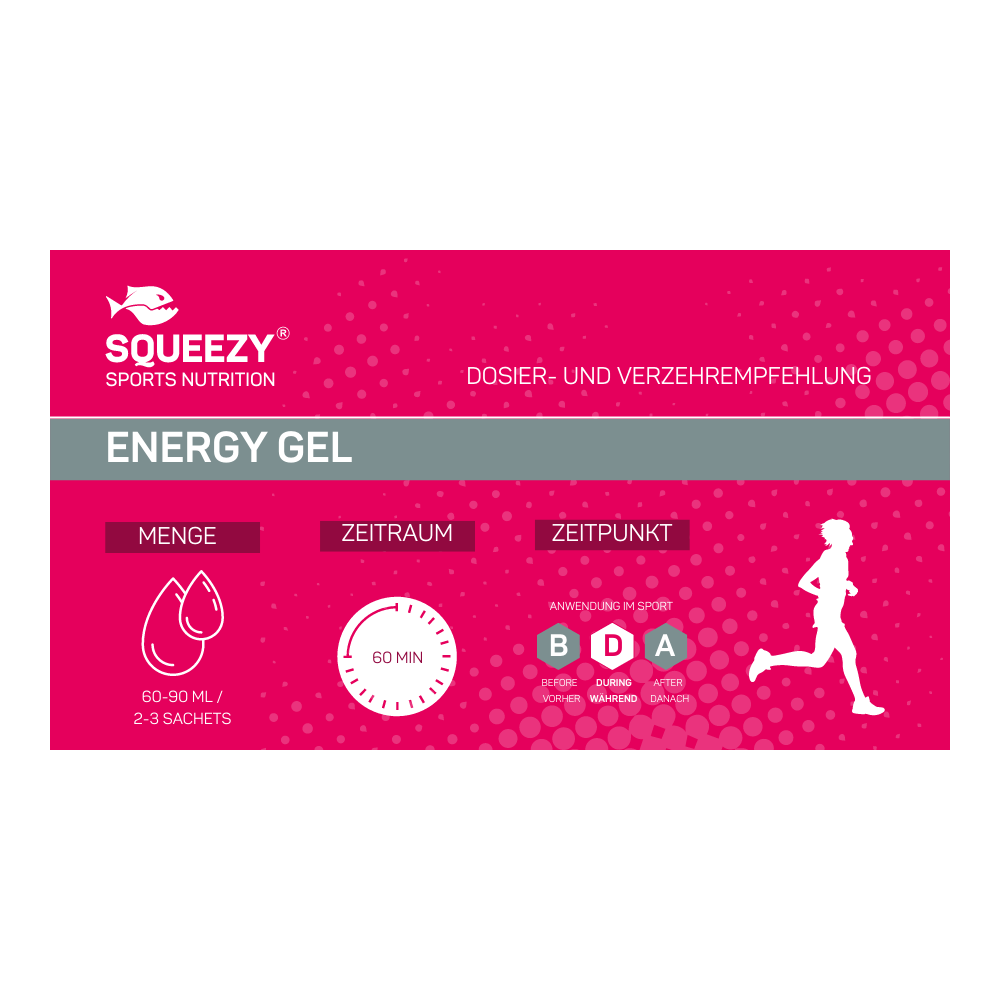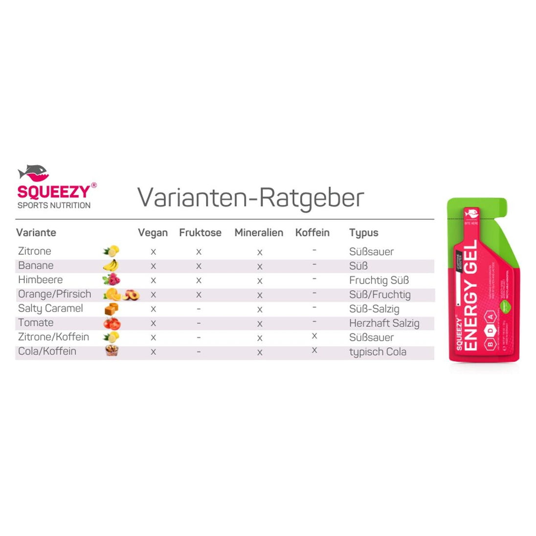 Squeezy ENERGY GELS waren weltweit die ersten Produkte dieser Art und bieten Ausdauersportlern in Training und Wettkampf eine smarte Lösung zur professionellen Aufrechterhaltung der Leistungsfähigkeit. Die Rezepturen folgen einer klaren Philosophie, die künstliche und unnötige Inhaltsstoffe sowie Farbstoffe verbietet und ganz allgemein alles ablehnt, was in irgendeiner Art und Weise die Magenverträglichkeit beeinflussen könnte.